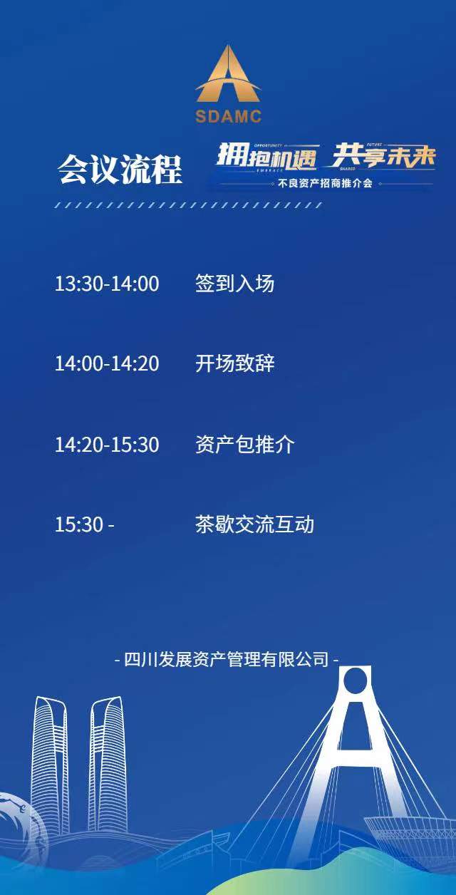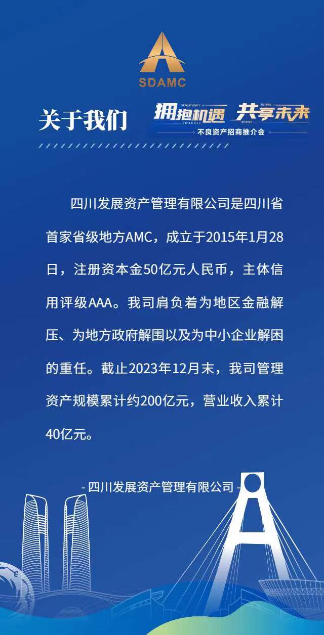 4月11日,四川發(fā)展資產(chǎn)管理有限公司將在成都高新區(qū)交子國際酒店舉辦“2024年不良資產(chǎn)招商推介會”,誠邀您的參與。