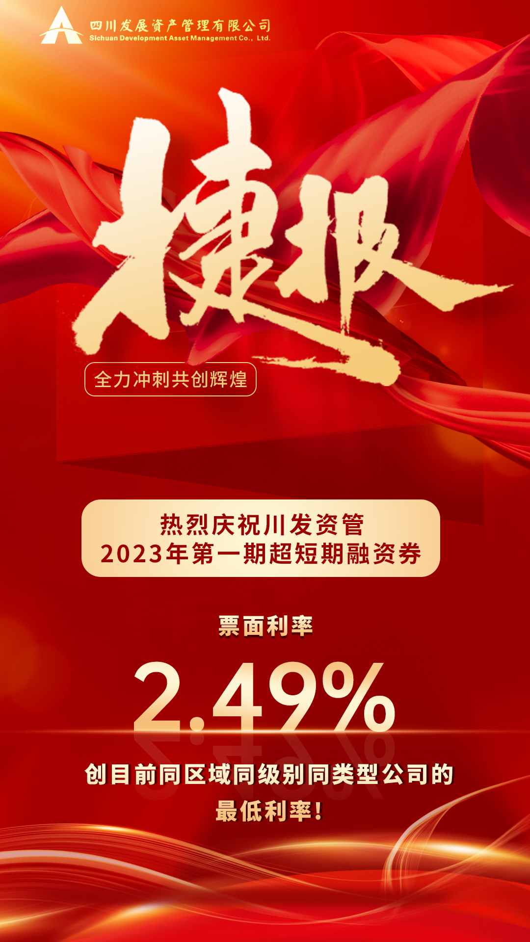2023年7月24日,四川發(fā)展資產(chǎn)管理有限公司2023年第一期超短期融資券在北金所成功發(fā)行,發(fā)行規(guī)模3億元,期限180天,由興業(yè)銀行承銷。本期債券發(fā)行獲大量投資者關(guān)注,全場(chǎng)認(rèn)購(gòu)倍數(shù)達(dá)2倍,最終取得2.49%的票面利率,為目前同區(qū)域同級(jí)別同類型公司的最低利率。